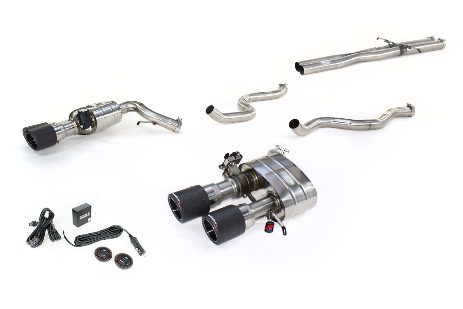 • Defined V8 sound with accentuated pops, bangs and burbles • Sound Architect Standalone Valve Control for full autonomy over volume • X-Pipe centre section for a robust V8 tone • Improved throttle response. • QuickSilver Branded 100mm Carbon Tips. • Two remote fobs • Sound module • Plug & play 12v power source • All required leads and batteries • Suitable for three pin SPS valves • Two distinct sound modes, ‘Sport’ and ‘Refined’ |